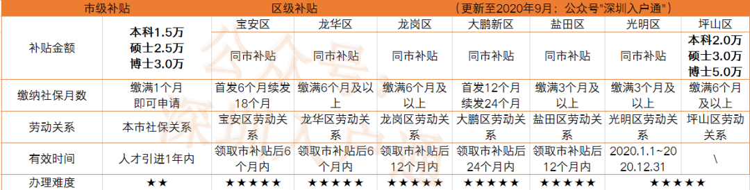 4 不可忽略的细节与重要提醒 ![]() 全日制大专以上学历可以直接办理深户,在办理深圳户口的时候,一般按照毕业证上的日期开始算,大多数地区只要不满两年就还算应届生。 有些人对于报到证改派有些迷糊,可直接关注微信公众号:深圳入户通,发送关键词 报到证改派,给你发一份详细的攻略。 ![]() 按照《深圳市人才引进实施办法》对调干、调工和招工的界定。 所谓调干,是指在户籍地有人事档案,商调到我市并经政府人力资源部门审核具有干部身份的手续。 如果档案里面有报到证和转正定级表,那么你的档案是人事档案,你属于干部序列,作为人才引进当然是调干了! 所谓调工,指在内地有正式单位,但是工人以调工的方式商调到深圳市并经政府人力资源部审核具有工人身份的手续。 如果有招工审批表,那么你的档案也是人事档案,但是身份是工人,可以以调工的方式入户深圳。 所谓招工,指在内地没有正式单位接收,深圳给你指标的单位招工你,招工基本上是从头开始。 如果你的档案里报到证、转正定级表、招工审批表统统都没有,那你就只能按招工的方式入户深圳了。 最后提醒一下,有没有干部身份对不同的人影响有区别,如果你打算从事公务员、事业单位、国企工作,干部身份还是很重要的;如果你选择在企业工作,那区别是很小的。 ![]() 有些外地的朋友,不在深圳工作,但又想保留入户深圳资格,于是找代办帮忙缴纳社保。帮忙缴纳社保是没问题的,但用这个缴纳记录入户深圳问题大了。 因为政府在审理入户手续的时候,会查看劳动合同,验证社保的合规性。别抱侥幸心理,一旦被发现,即使入户了,也会被取消资格,甚至还要承担刑事责任。 当然如果你有办法非深圳的地区工作,又能拿到一份深圳地区公司的合法劳务合同,这时缴纳的社保是有效的。 如果以后注意改变了,确定不再有入深户的想法,把医疗保险和养老保险转移到老家或者别处就是了。 同理,要是以后再来深圳生活,可以把社保转移到深圳来。 ![]() 普遍来说,按照以下落户优先级来考虑适合自己的落户方式。 1、优先房产落户 自己在深圳有房产,房产在哪个区,落户哪个区。 2、优先有区补的区域 看自己工作的区域是否有区补贴,有的话就落户该区。区补一般要求在对应区域工作,单纯入户该区,社保不在该区,一样拿不到区补贴。 3、亲友房产所在区域 如果有亲友在深圳有房产,并且同意你挂靠户口,那他房产在哪个区就选择该区。好处是该户口稳定,借用户口本方便。 4、选择自己社保所在区域 如果社保所在区没有区补,又不想换工作,那就以工作为重,入户该区吧,办理起来会省事一点。